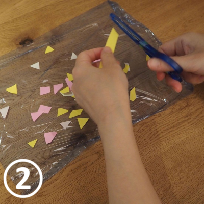 デコラップの上に、折り紙をハサミで適当なサイズにカットして、星のように散らします。