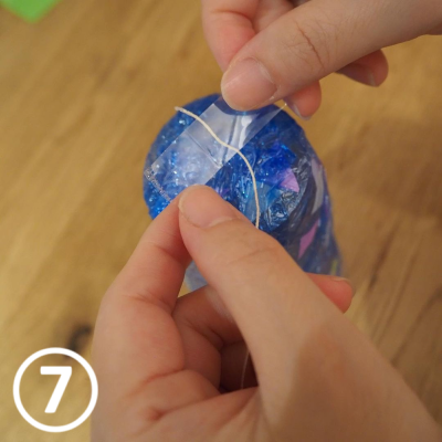 ゴム糸で吊るしてぴょんぴょん跳ねるようにしました。