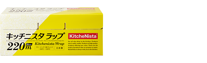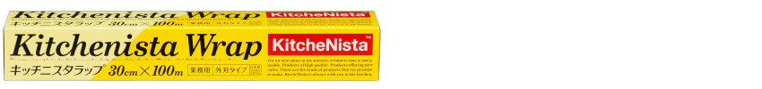 キッチニスタラップは、業務用飲食店をはじめ、プロの調理現場で最も多く使用されている塩ビ小巻ラップ。厨房でプロの料理人が求める機能と価格を両立させる、コストパフォーマンスに優れた食品用ラップです。箱からスッと切れ、しなやかに伸び、ピタッと貼りついて、はがしやすい。その使い勝手の良さと、豊富なサイズ・種類・機能性により、料理のプロが支持する業務用小巻ラップとして、レストランやホテルなどの外食産業で多くの飲食店に愛用されています。