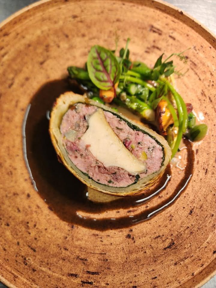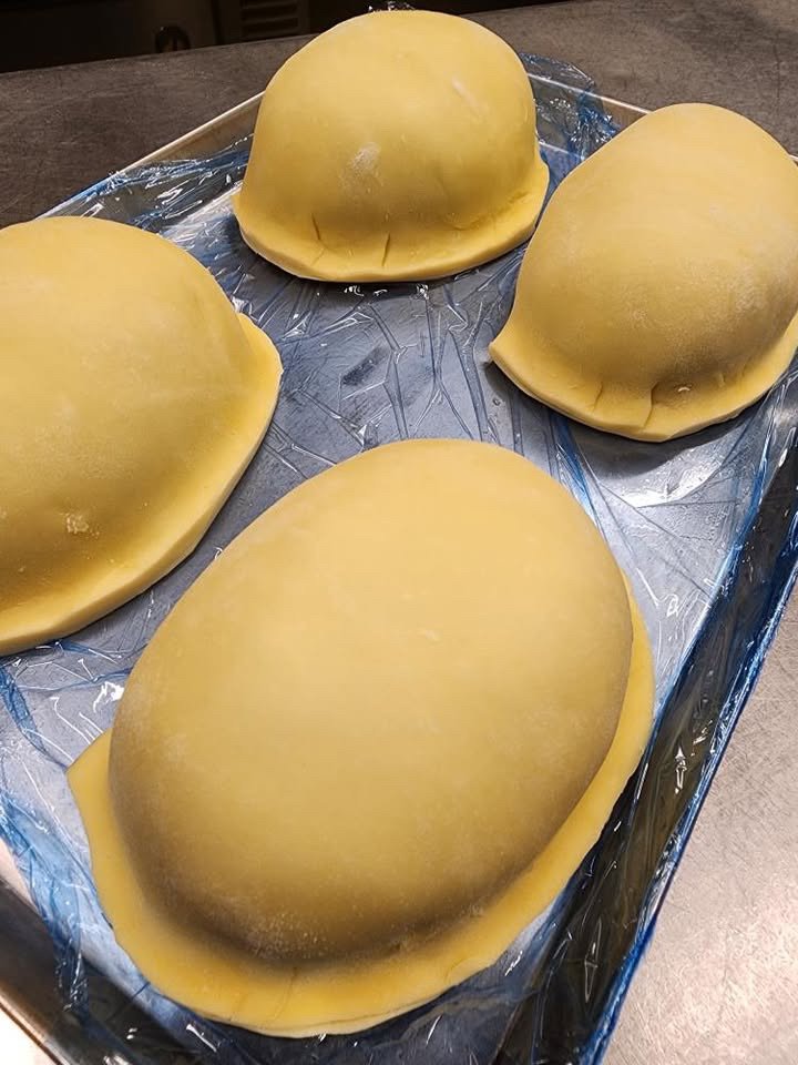(6)パイ生地で包み、卵黄を塗ってレイエを入れます。