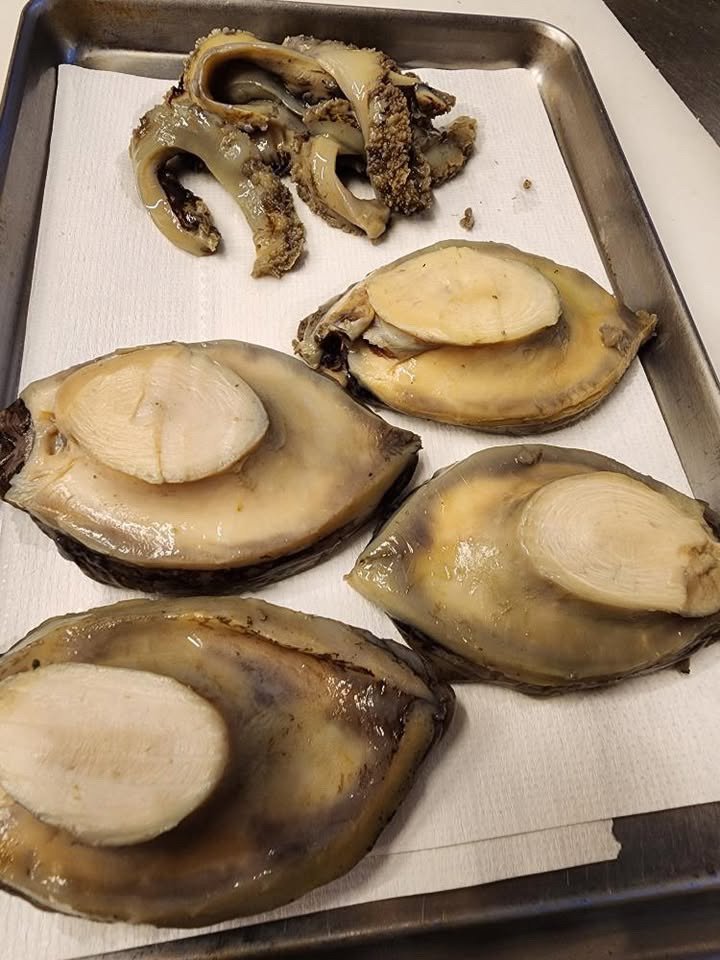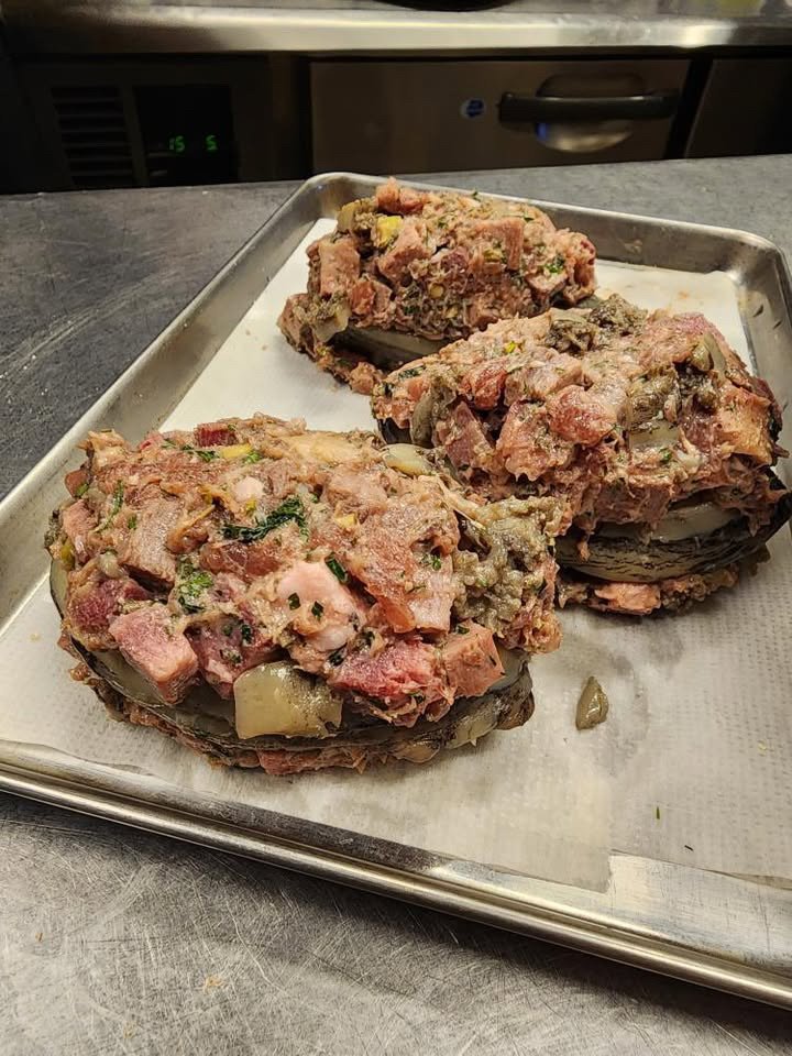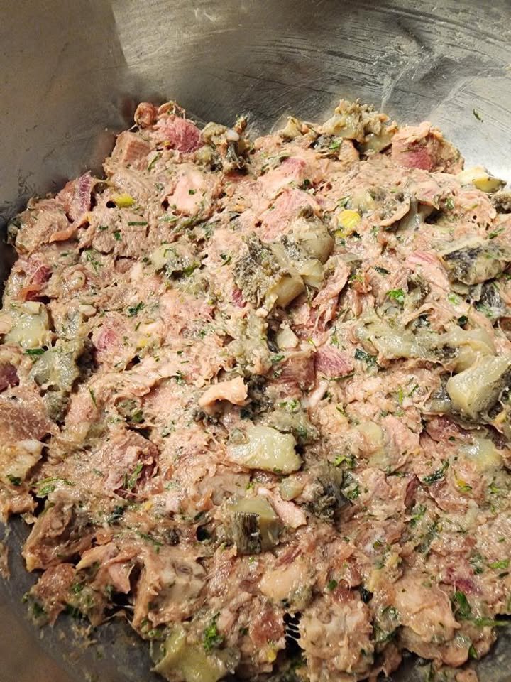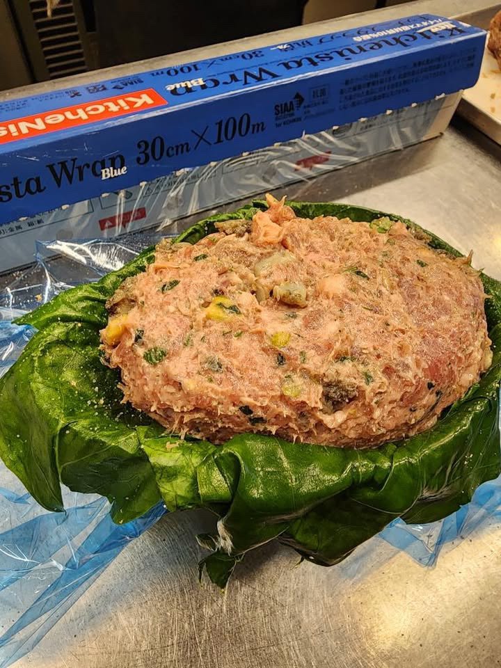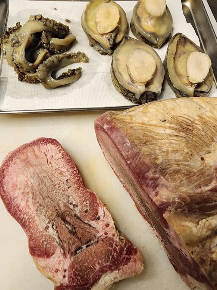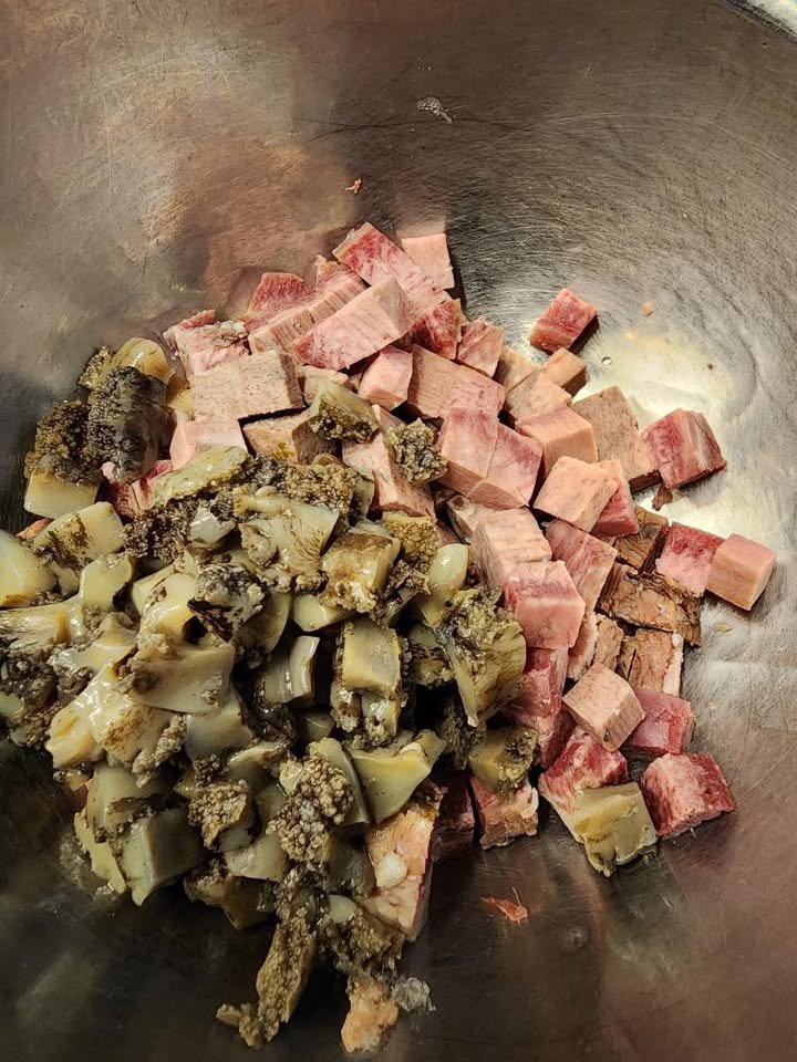 (3)ボイルした牛タンの塩漬けと、アワビのエンペラを角切りにして豚肉のパテと混ぜ合わせます。