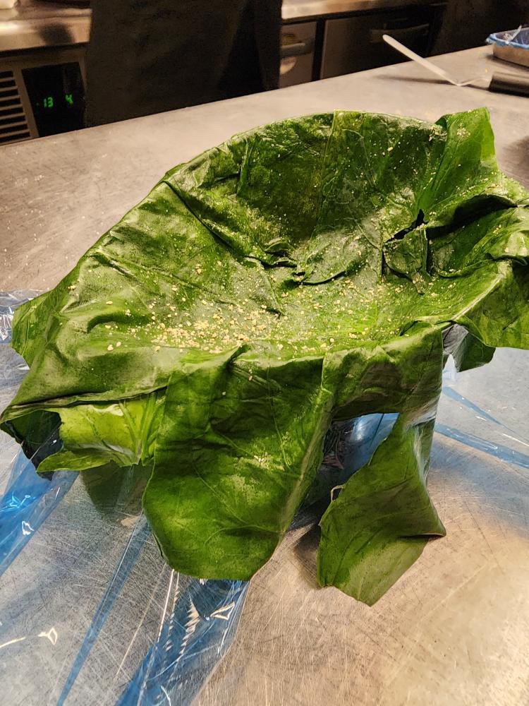 (5)混ぜ合わせたパテでアワビ本体を包み、型のほうれん草で包みます。