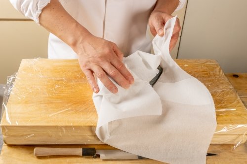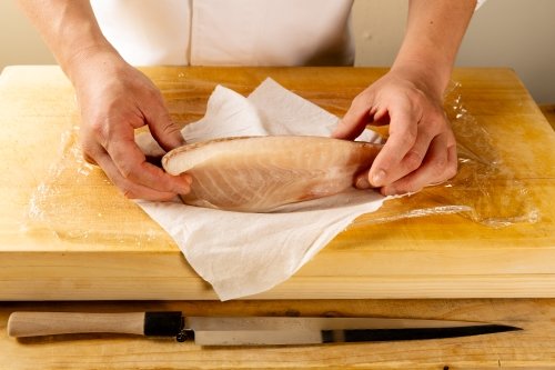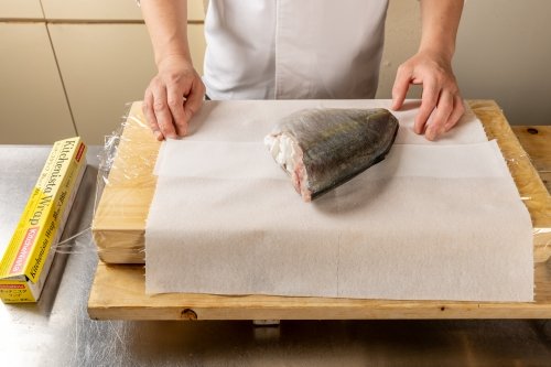 魚にドリップペーパーを巻いてから、キッチニスタラップをギュッと巻き込み、ペーパーとラップを替える。これを日に2~3回、3日ほど繰り返して魚の余分な水分や血、臭みを取り除いていく。