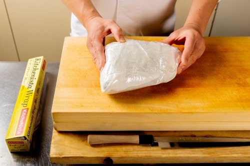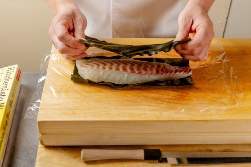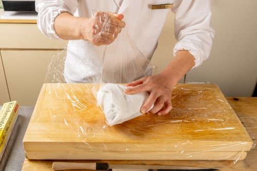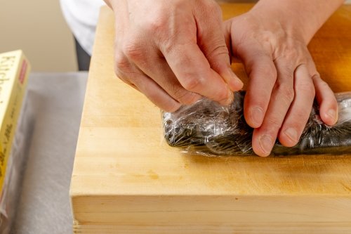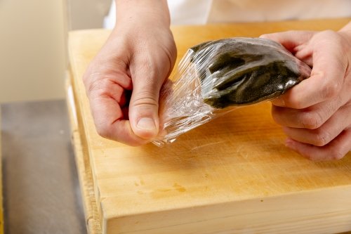 鯛に強めに塩をして水分を抜き、昆布を敷いて巻き込むのにも、キッチニスタラップの伸びと密着性により、圧をかけて巻きつけやすい。